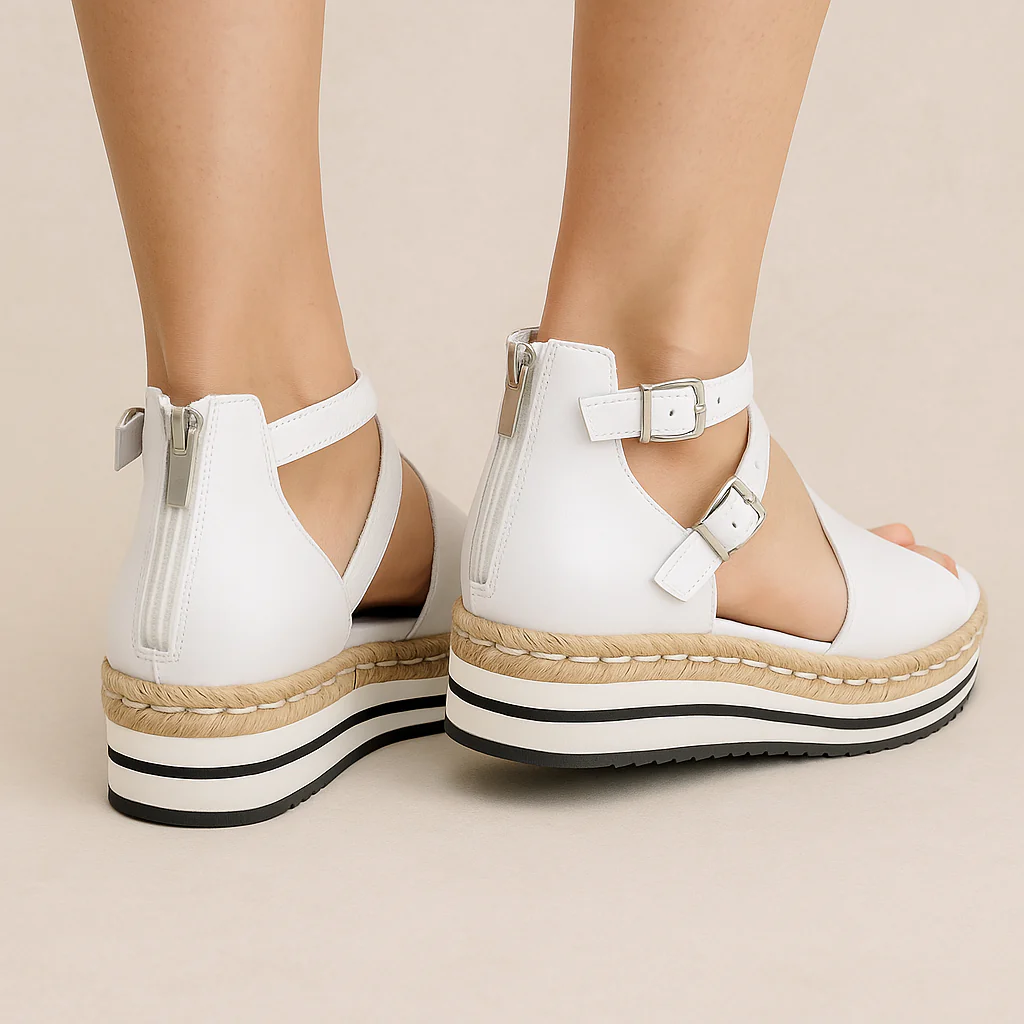 The epitome of summer chic, Django & Juliette Alexys White fuses the edginess of the biker trend with iconic espadrille soles to create a striking design you can wear every day. The pair boasts a strappy silhouette detailed with silver buckles, resting on chunky striped midsoles with braided jute trim.